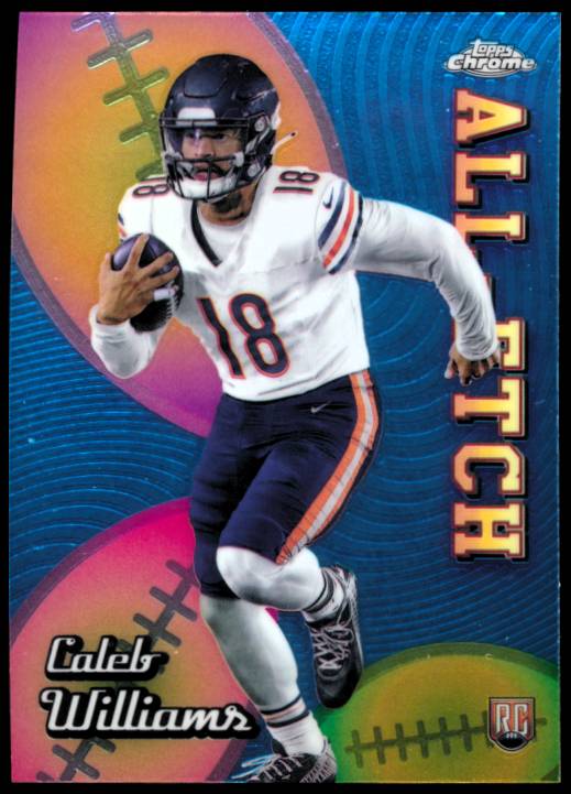 Caleb Williams, an immensely talented quarterback, played college football at the University of Southern California (USC). Williams was drafted first overall in the first round of the 2024 NFL Draft by the Chicago Bears. Williams had pre-rookie cards in earlier sets but his rookie cards are in 2024 sets.