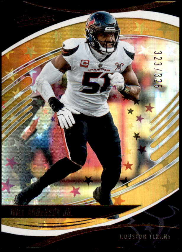 Will Anderson played college football at the University of Alabama, where he distinguished himself as a dominant linebacker. Known for his exceptional defensive skills, he received multiple accolades including the Bronko Nagurski Trophy and was named a unanimous All-American. Anderson was drafted in the first round of the NFL Draft by the Houston Texans, marking a significant milestone in his promising career. His rookie cards are found in 2023 sets such as the 2023 rookie card pictured.