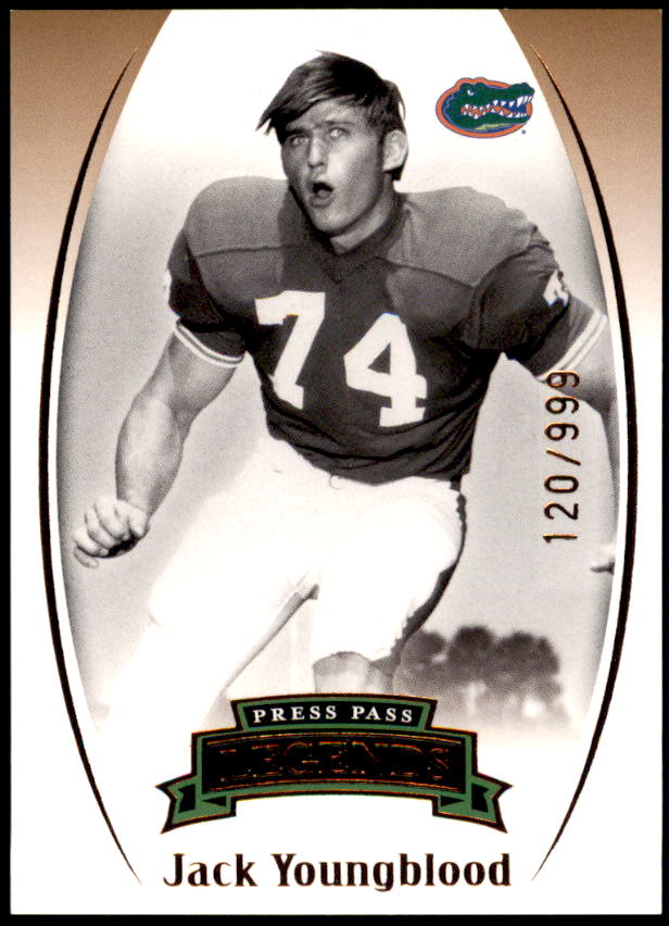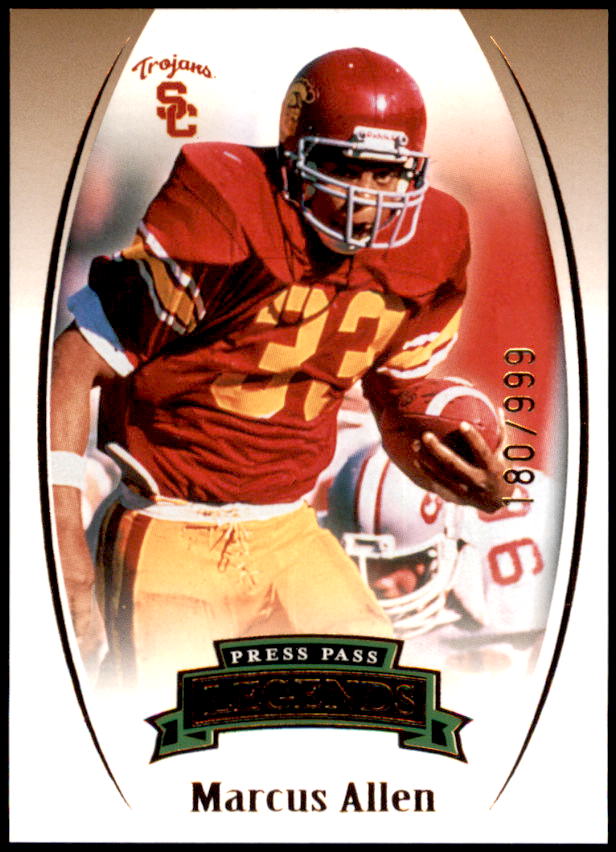The 2007 Press Pass Legends football card set consists of 100 cards. It contains a mix of rookies from 2007 and legends of the past. There are various parallel sets including a bronze (#'d to 999) and silver set (#'d to 499). Players are pictured in their college uniform.