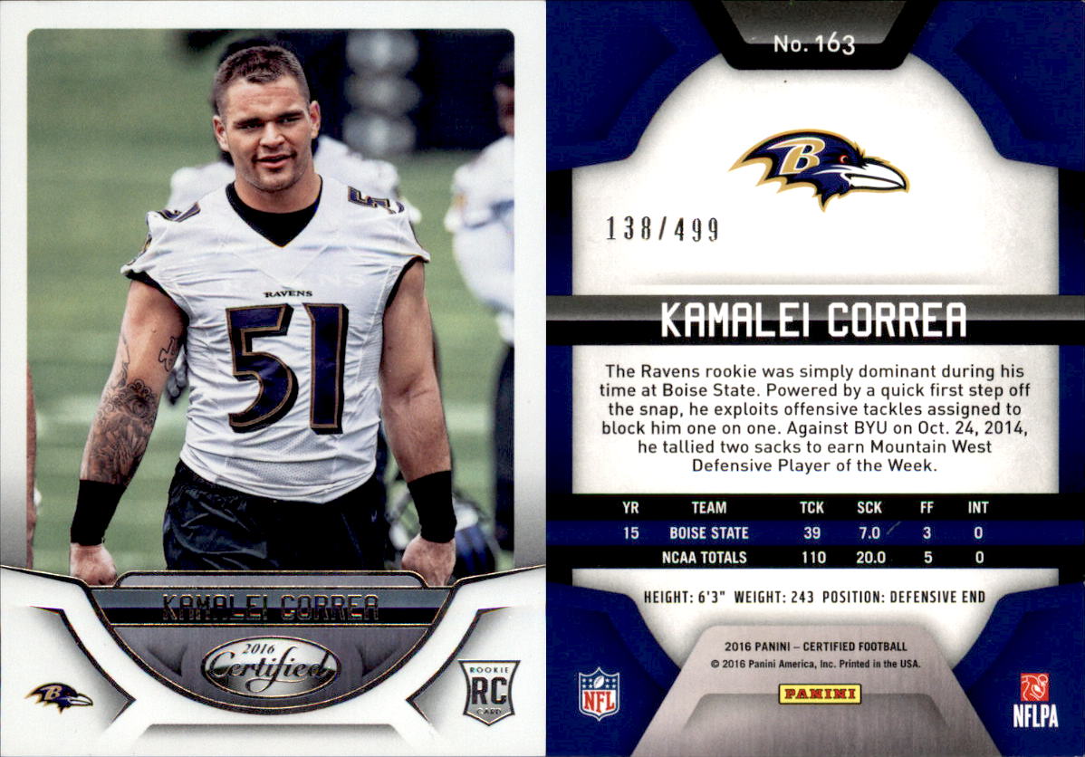 The 2016 Panini Certified football card set consists of 240 cards. There are 100 base veteran cards, 35 numbered legends cards, 65 numbered rookie cards and 40 rookie autograph jersey cards of the top 2016 rookies.
