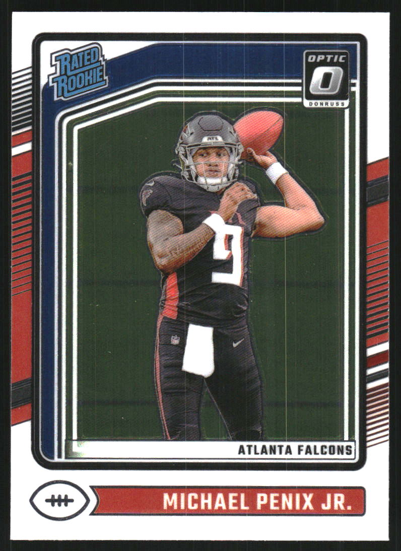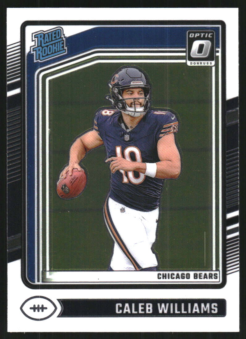 The 2024 Donruss Optic football card set consists of 300 cards. It includes 200 base cards and 100 Rated Rookies. Top rookies include Jayden Daniels, Caleb Williams, Bo Nix, Drake Maye and many other top rookies from the 2024 class.