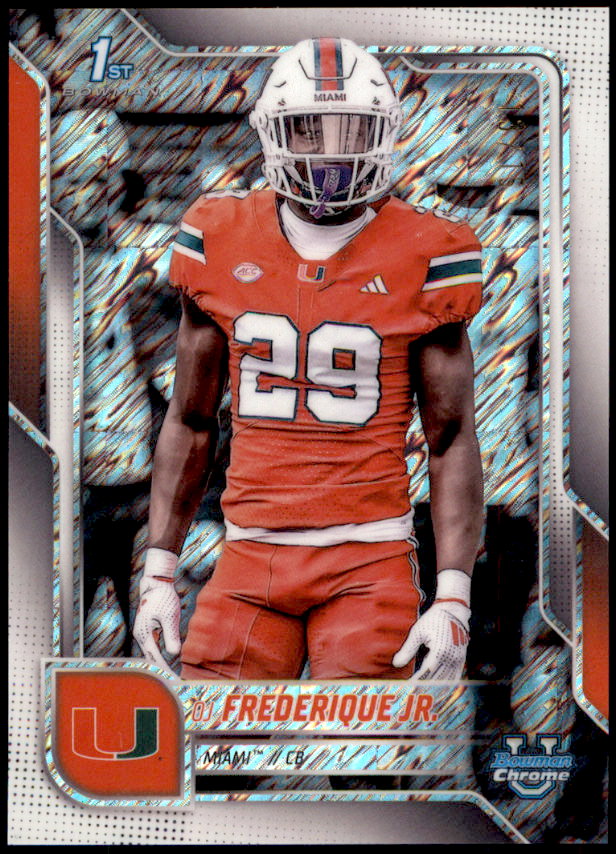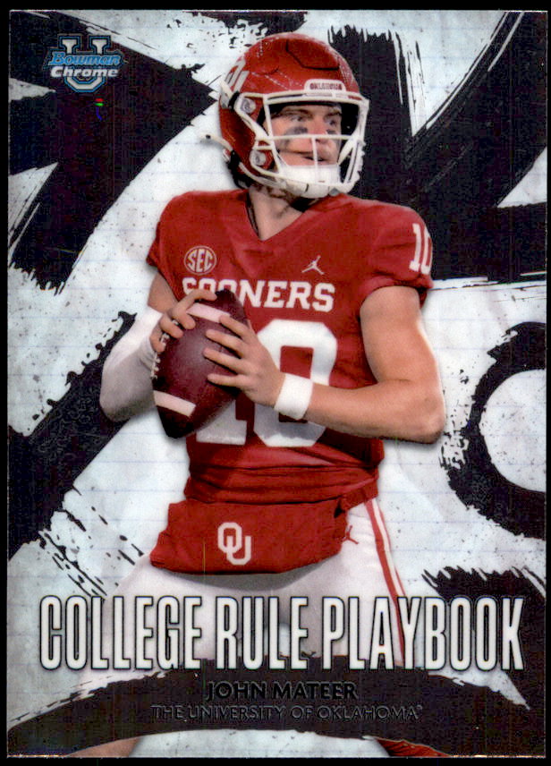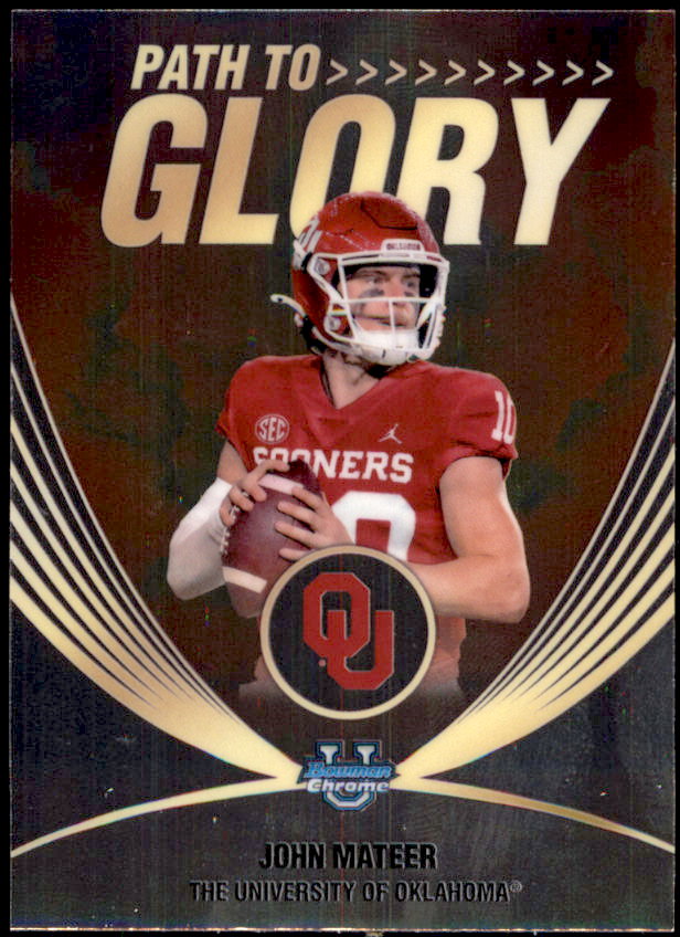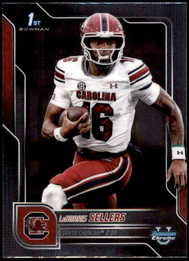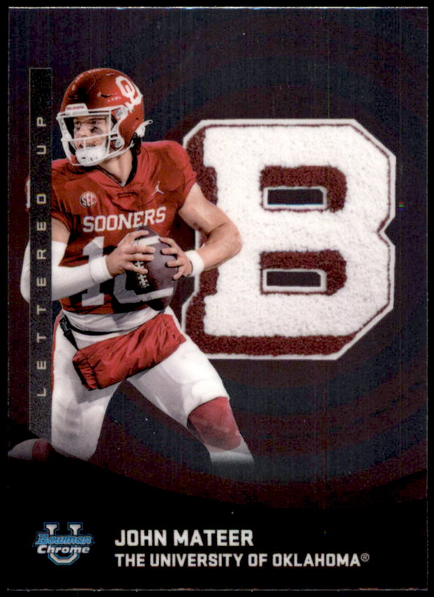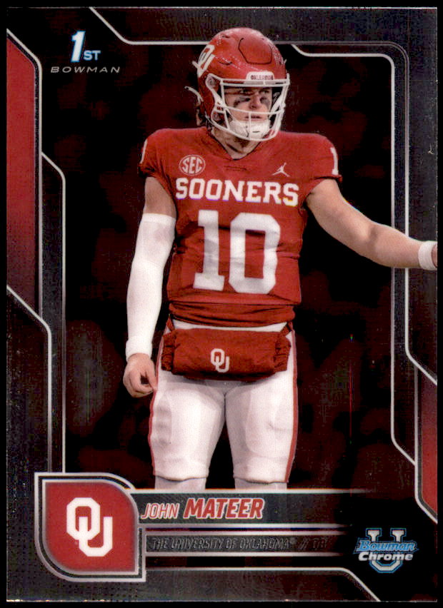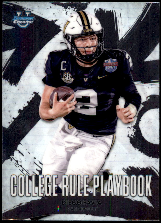 The 2025 Bowman Chrome University football card set consists of 200 cards. It includes cards of the top college stars including Fernando Mendoza, Diego Pavia, Bryce Underwood, John Mateer and many others.