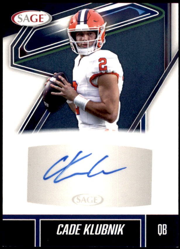 The 2026 Sage football card set consists of 100 cards. Some of the players included in the set are Cade Klubnick, Garrett Nussmeier, Drew Allar, Jordan Tyson, LaNorris Sellers, Carnell Tate and others.