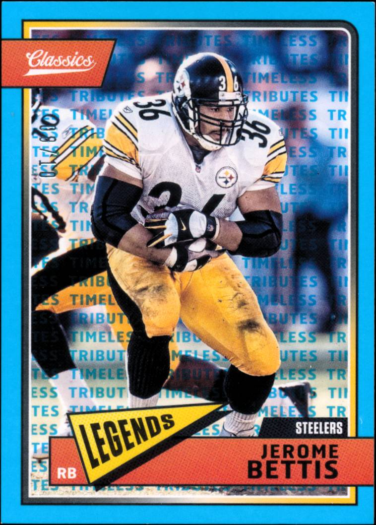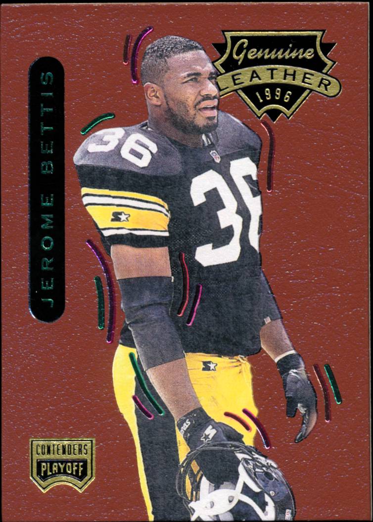 Jerome Bettis was picked in the first round (10th overall) of the 1993 NFL draft by the Los Angeles Rams. He attended the University of Notre Dame for his college career. Jerome Bettis was traded to the Pittsburgh Steelers in 1996 and has been been named to 6 Pro Bowls. His nickname is "The Bus". Jerome Bettis won his first Super Bowl as the Steelers defeated the Seattle Seahawks in Super Bowl XL. He retired shortly thereafter and will be a studio commentator for NBC. Jerome Bettis' rookie cards are found in 1993 sets.
