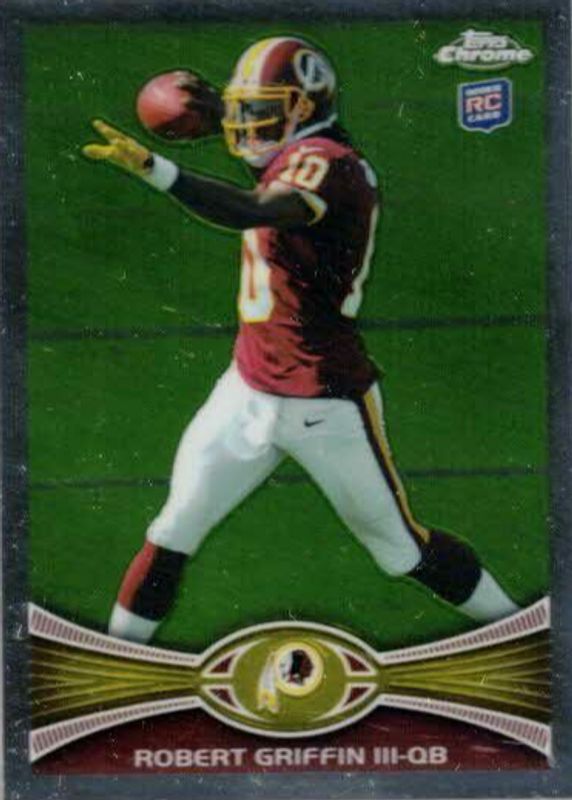 Robert Griffin III, known as RG3, played college football at Baylor University, where he won the Heisman Trophy in 2011. He was selected second overall in the 2012 NFL Draft by the Washington Redskins. Griffin earned the NFL Offensive Rookie of the Year award in his debut season and set several records, including the highest passer rating by a rookie quarterback. Despite a promising start, his career was marred by injuries, leading to subsequent stints with the Cleveland Browns and Baltimore Ravens. RG3 has many different rookie cards in 2012 sets.