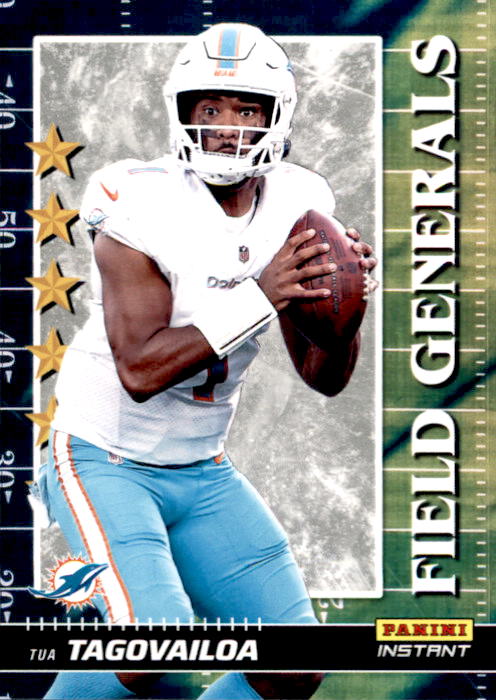 Tua Tagovailoa is a quarterback for the Miami Dolphins in the National Football League. He played college football at the University of Alabama, where he won a national championship in 2017 and was named MVP of the game. Tagovailoa was selected fifth overall by the Dolphins in the 2020 NFL Draft. During his college career, he received numerous accolades, including the Walter Camp Award, Maxwell Award, and was named SEC Offensive Player of the Year in 2018. In the NFL, he has shown promise as a starting quarterback for the Dolphins, leading the league in passer rating in 2022. His rookie trading cards are from 2020.
